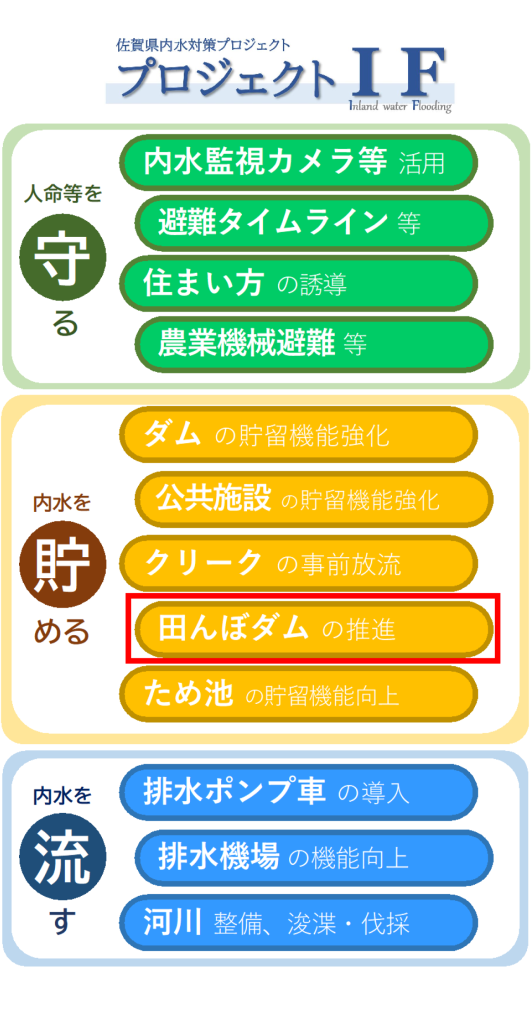 このプロジェクトは「人命等を守る」「内水を貯める」「内水を流す」の3つの柱で構成され、「内水を貯める」取組の1つとして推進を始めたのが「田んぼダム」という取り組みです。